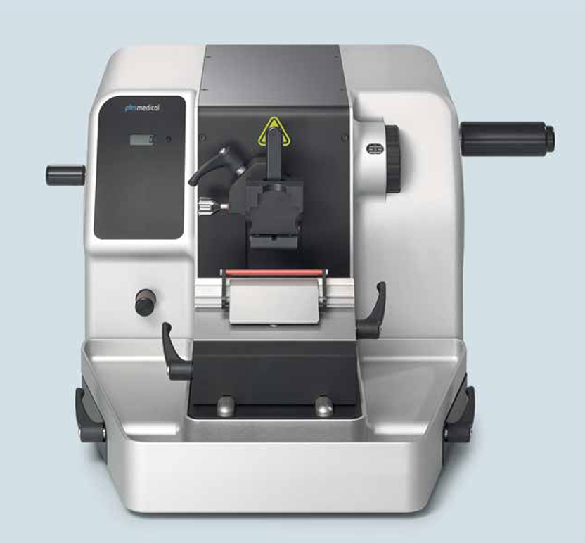 Standardní rotační mikrotom nové konstrukce s retrakcí s manuálním ovládáním makro i mikro posuvu (krájení).